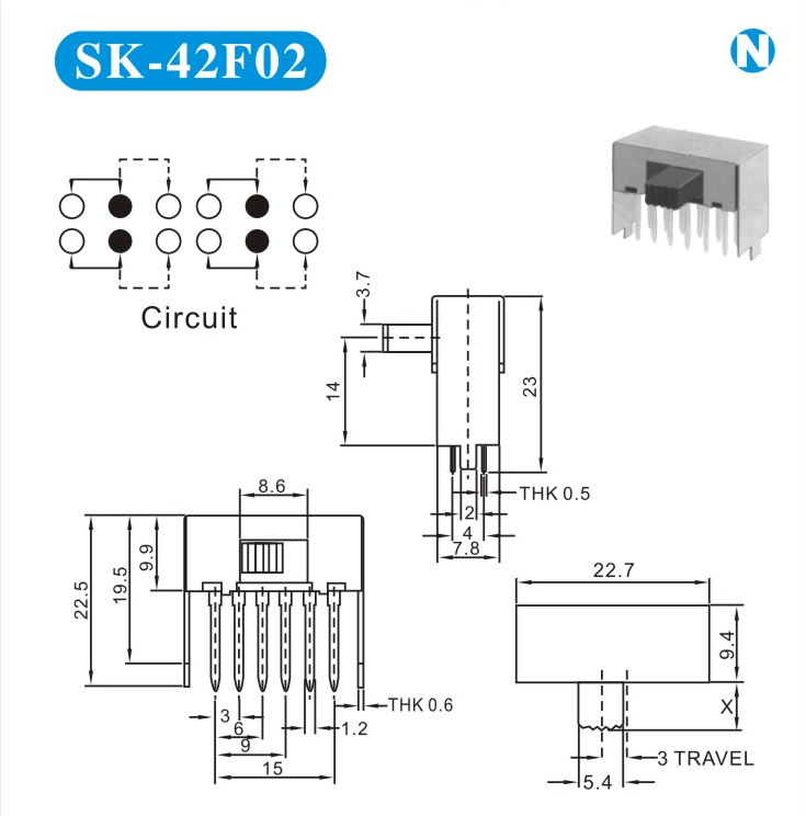 SK-42F02 詳細資料 產品說明: 技術指標: 使用溫度范圍 -20~+70℃ 耐壓 AC250V(50Hz)/min 額定負荷 DC 50V 0.5A 動作力 250±100gf 接觸電阻 ≤0.05Ω 機械壽命 10000次 絕緣電阻 ≥100MΩ
