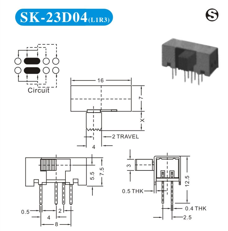 SK-23D04 詳細資料 產品說明: 技術指標: 使用溫度范圍 -20~+70℃ 耐壓 AC250V(50Hz)/min 額定負荷 DC 50V 0.5A 動作力 250±100gf 接觸電阻 ≤0.05Ω 機械壽命 10000次 絕緣電阻 ≥100MΩ