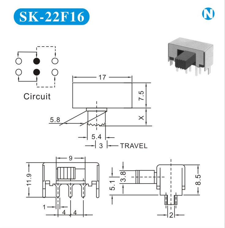 SK-22F16 詳細資料 產品說明: 技術指標: 使用溫度范圍 -20~+70℃ 耐壓 AC250V(50Hz)/min 額定負荷 DC 50V 0.5A 動作力 250±100gf 接觸電阻 ≤0.05Ω 機械壽命 10000次 絕緣電阻 ≥100MΩ