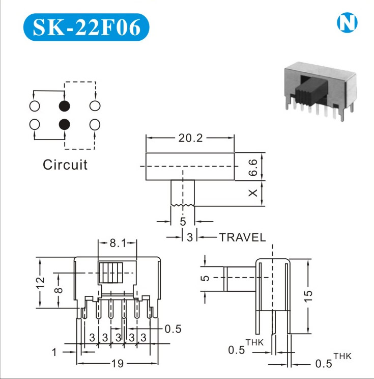 SK-22F06 詳細資料 產品說明: 技術指標: 使用溫度范圍 -20~+70℃ 耐壓 AC250V(50Hz)/min 額定負荷 DC 50V 0.5A 動作力 250±100gf 接觸電阻 ≤0.05Ω 機械壽命 10000次 絕緣電阻 ≥100MΩ