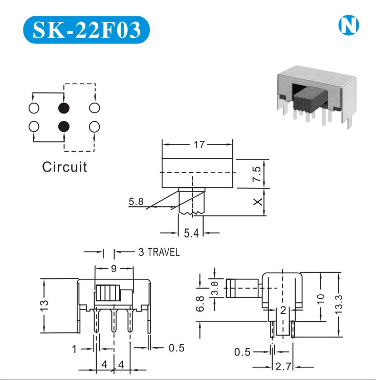 SK-22F03 詳細資料 產品說明: 技術指標: 使用溫度范圍 -20~+70℃ 耐壓 AC250V(50Hz)/min 額定負荷 DC 50V 0.5A 動作力 250±100gf 接觸電阻 ≤0.05Ω 機械壽命 10000次 絕緣電阻 ≥100MΩ