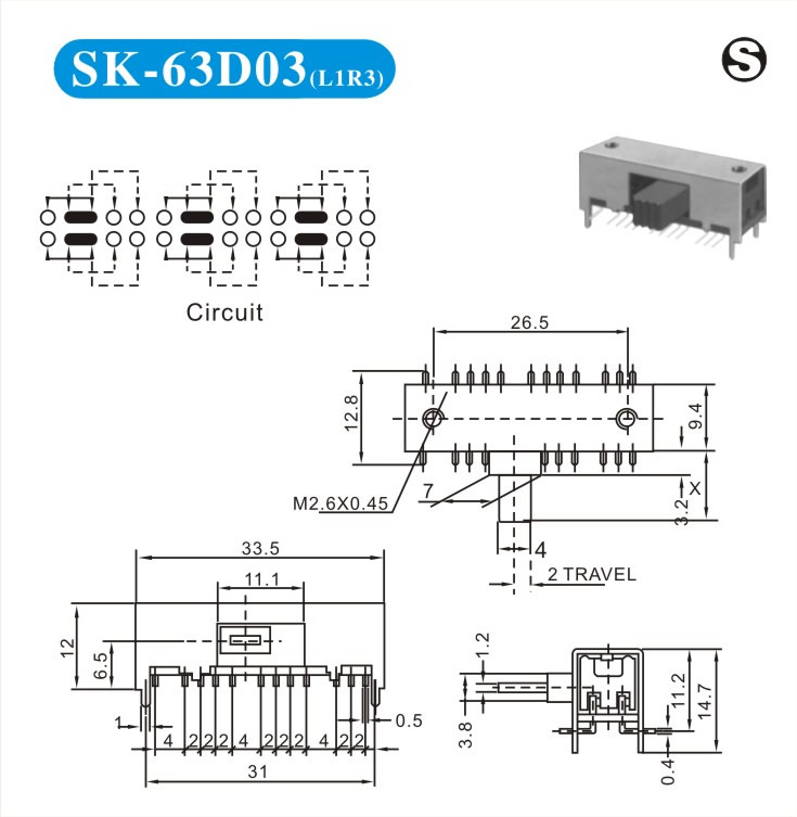 SK-63D03 詳細資料 產品說明: 技術指標: 使用溫度范圍 -20~+70℃ 耐壓 AC250V(50Hz)/min 額定負荷 DC 50V 0.5A 動作力 250±100gf 接觸電阻 ≤0.05Ω 機械壽命 10000次 絕緣電阻 ≥100MΩ