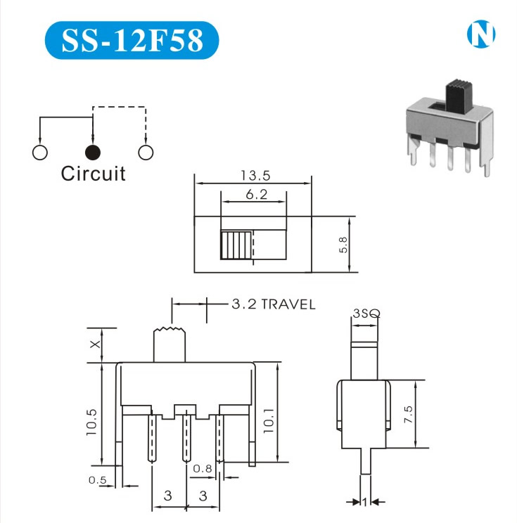 SS-12F58 詳細資料 產品說明: 技術指標: 使用溫度范圍 -20~+70℃ 耐壓 AC250V(50Hz)/min 額定負荷 DC 50V 0.5A 動作力 250±100gf 接觸電阻 ≤0.05Ω 機械壽命 10000次 絕緣電阻 ≥100MΩ