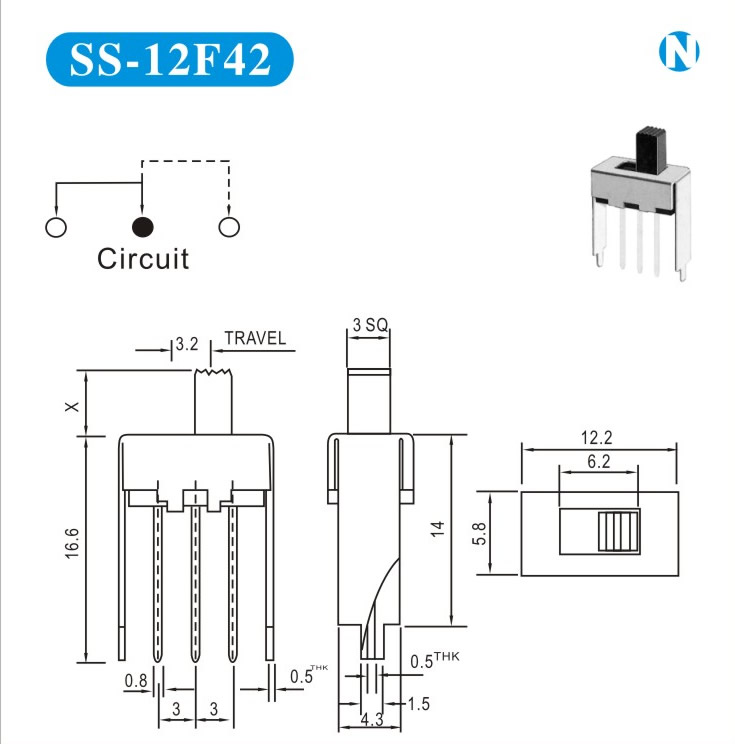SS-12F42 詳細資料 產(chǎn)品說明: 技術(shù)指標: 使用溫度范圍 -20~+70℃ 耐壓 AC250V(50Hz)/min 額定負荷 DC 50V 0.5A 動作力 250±100gf 接觸電阻 ≤0.05Ω 機械壽命 10000次 絕緣電阻 ≥100MΩ