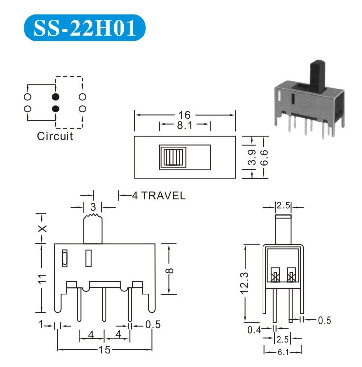 SS-22H01 詳細資料 產品說明: 技術指標: 使用溫度范圍 -20~+70℃ 耐壓 AC250V(50Hz)/min 額定負荷 DC 50V 0.5A 動作力 250±100gf 接觸電阻 ≤0.05Ω 機械壽命 10000次 絕緣電阻 ≥100MΩ