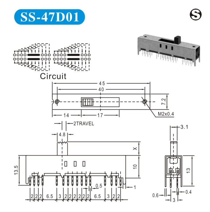 SS-47D01 詳細資料 產品說明: 技術指標: 使用溫度范圍 -20~+70℃ 耐壓 AC250V(50Hz)/min 額定負荷 DC 50V 0.5A 動作力 250±100gf 接觸電阻 ≤0.05Ω 機械壽命 10000次 絕緣電阻 ≥100MΩ