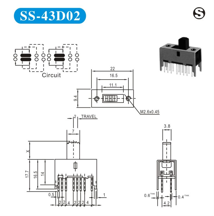 SS-43D02 詳細資料 產品說明: 技術指標: 使用溫度范圍 -20~+70℃ 耐壓 AC250V(50Hz)/min 額定負荷 DC 50V 0.5A 動作力 250±100gf 接觸電阻 ≤0.05Ω 機械壽命 10000次 絕緣電阻 ≥100MΩ